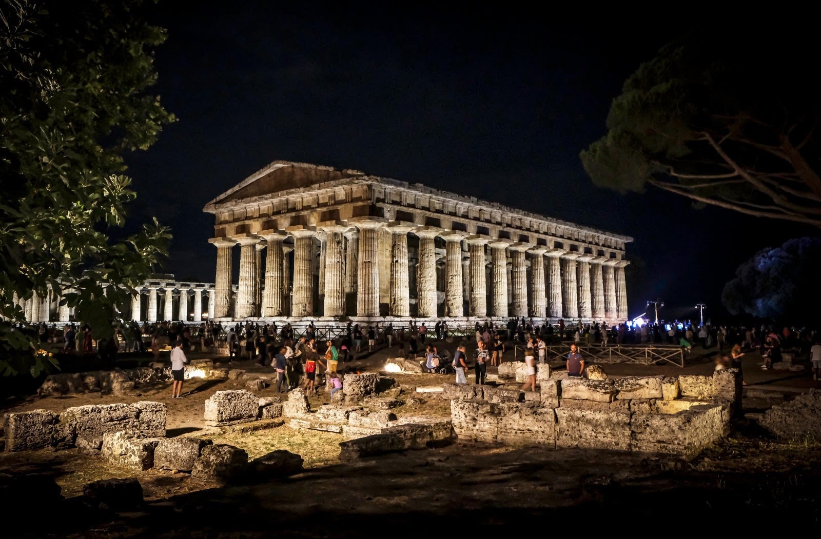 Paestum è uno dei siti archeologici più affascinanti d’Italia, famoso per i suoi imponenti templi dorici perfettamente conservati. Passeggiando tra le antiche rovine si respira la grandezza della Magna Grecia, con il Tempio di Nettuno, la Basilica e il Tempio di Cerere che dominano il paesaggio. Un luogo unico, dove storia, arte e natura si incontrano in un’atmosfera senza tempo.